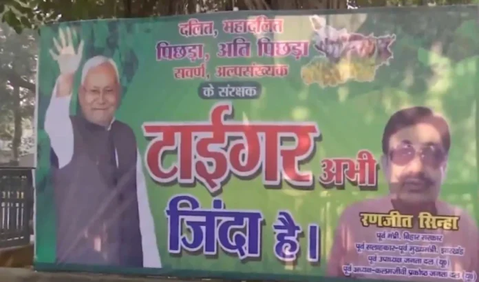 बिहार के पूर्व मंत्री रंजीत सिन्हा द्वारा पटना स्थित जनता दल (यूनाइटेड) कार्यालय के बाहर लगाए गए एक पोस्टर में मुख्यमंत्री नीतीश कुमार को ‘टाइगर ज़िंदा है’ की उपाधि दी गई है और उन्हें समाज के हाशिये पर पड़े लोगों सहित सभी समुदायों का “रक्षक” बताया गया है। यह पोस्टर पार्टी कार्यकर्ताओं की नीतीश कुमार को चौथी बार बिहार का मुख्यमंत्री बनते देखने की इच्छा को दर्शाता है। 2025 के बिहार विधानसभा चुनावों में विपक्षी महागठबंधन ने निश्चित रूप से मुख्यमंत्री पद के उम्मीदवार की घोषणा में देरी को लेकर कड़ी और लगातार आलोचना की है।