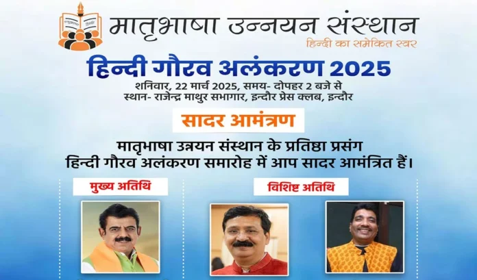 इंदौर। हिन्दी भाषा के विस्तार के लिए लगातार कार्यरत ‘मातृभाषा उन्नयन संस्थान’ शनिवार 22 मार्च 2025 को स्थानीय राजेन्द्र माथुर सभागार, इन्दौर प्रेस क्लब में दोपहर 2 बजे से हिन्दी गौरव अलंकरण समारोह आयोजित करने जा रहा है।