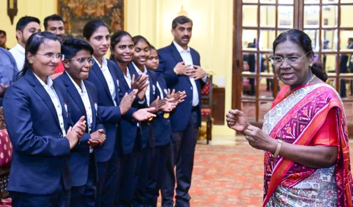 टी20 विश्व कप जीतने वाली भारतीय दृष्टिबाधित महिला टीम ने शनिवार को राष्ट्रपति द्रौपदी मुर्मू से राष्ट्रपति भवन में मुलाकात की और उन्हें ऑटोग्राफ वाला क्रिकेट बल्ला उपहार में दिया।