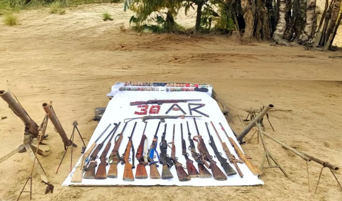 शुक्रवार को बिष्णुपुर जिले के लैशोई हिल्स क्षेत्र में तलाशी अभियान के दौरान सुरक्षा बलों ने भारी मात्रा में हथियार और गोला-बारूद जब्त किया। बरामद वस्तुओं में एक एसएलआर राइफल और एक मैगजीन, एक कार्बाइन मशीन गन, एक .303 राइफल, एक डबल बैरल बंदूक, 48 राउंड गोला-बारूद, दो ग्रेनेड, दो बुलेटप्रूफ जैकेट और कई अन्य सामान शामिल हैं।