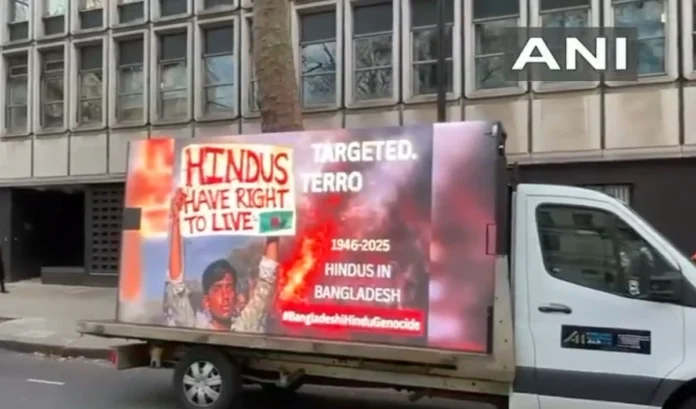 प्रदर्शनकारियों ने एक डिजिटल वैन का उपयोग किया, जिस पर बांग्लादेश में हिंदुओं के खिलाफ हुई हिंसा के आंकड़े और तस्वीरें प्रदर्शित की गईं।