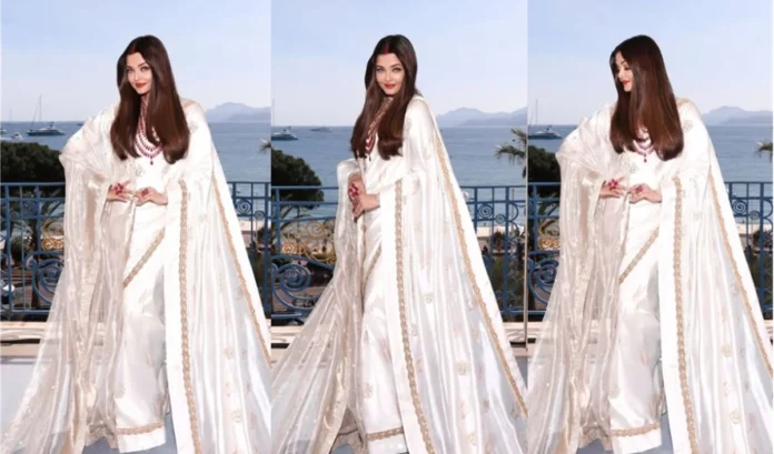 ऐश्वर्या ने हाथीदांत रंग की बनारसी साड़ी पहनी