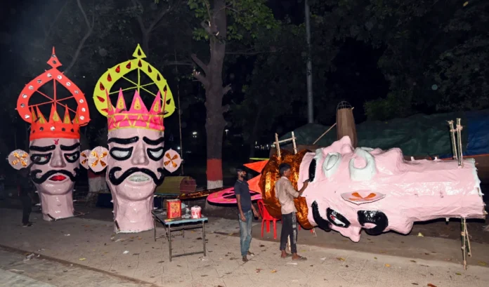 शहर के कुछ हिस्सों में दशहरा समारोह के लिए तैयार किए जा रहे रावण के विशाल पुतलों को मंगलवार को हुई तेज बारिश से नुकसान पहुंचा।
