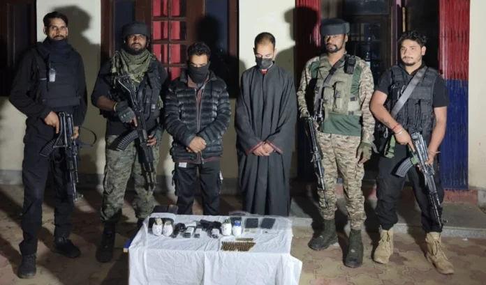 जम्मू-कश्मीर पुलिस ने सोमवार को बताया कि शोपियां के डीके पोरा इलाके में दो आतंकवादी सहयोगियों को गिरफ्तार किया गया है। उन्हें भारतीय सेना की 34RR SOG शोपियां और सीआरपीएफ 178 बटालियन के संयुक्त अभियान में गिरफ्तार किया गया। समाचार एजेंसी एएनआई ने शोपियां पुलिस के हवाले से बताया, “दो पिस्तौल, चार ग्रेनेड, 43 जिंदा कारतूस और अन्य आपत्तिजनक सामग्री भी बरामद की गई।”