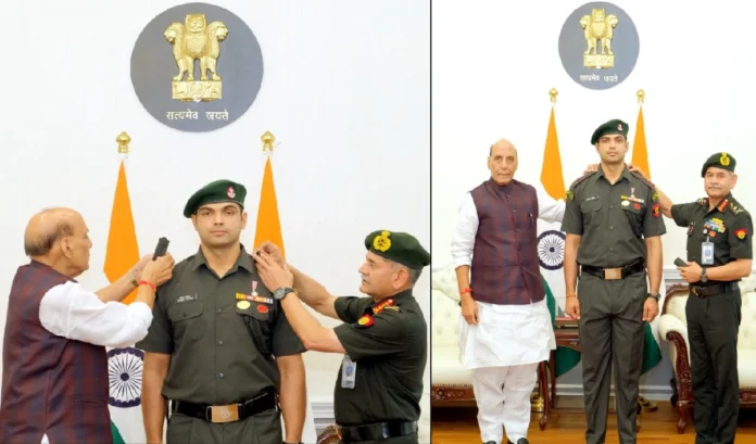 #WATCH | Delhi | Olympic medallist javelin thrower Neeraj Chopra conferred the honorary rank of Lieutenant Colonel in the Indian Army, in the presence of Defence Minister Rajnath Singh and COAS General Upendra Dwivedi pic.twitter.com/bjLwuvoSLj